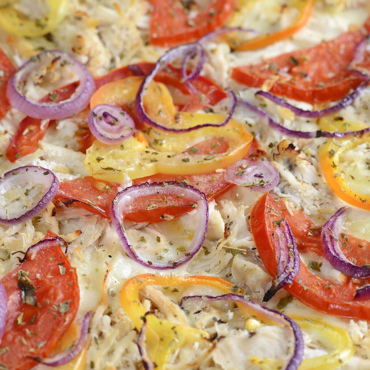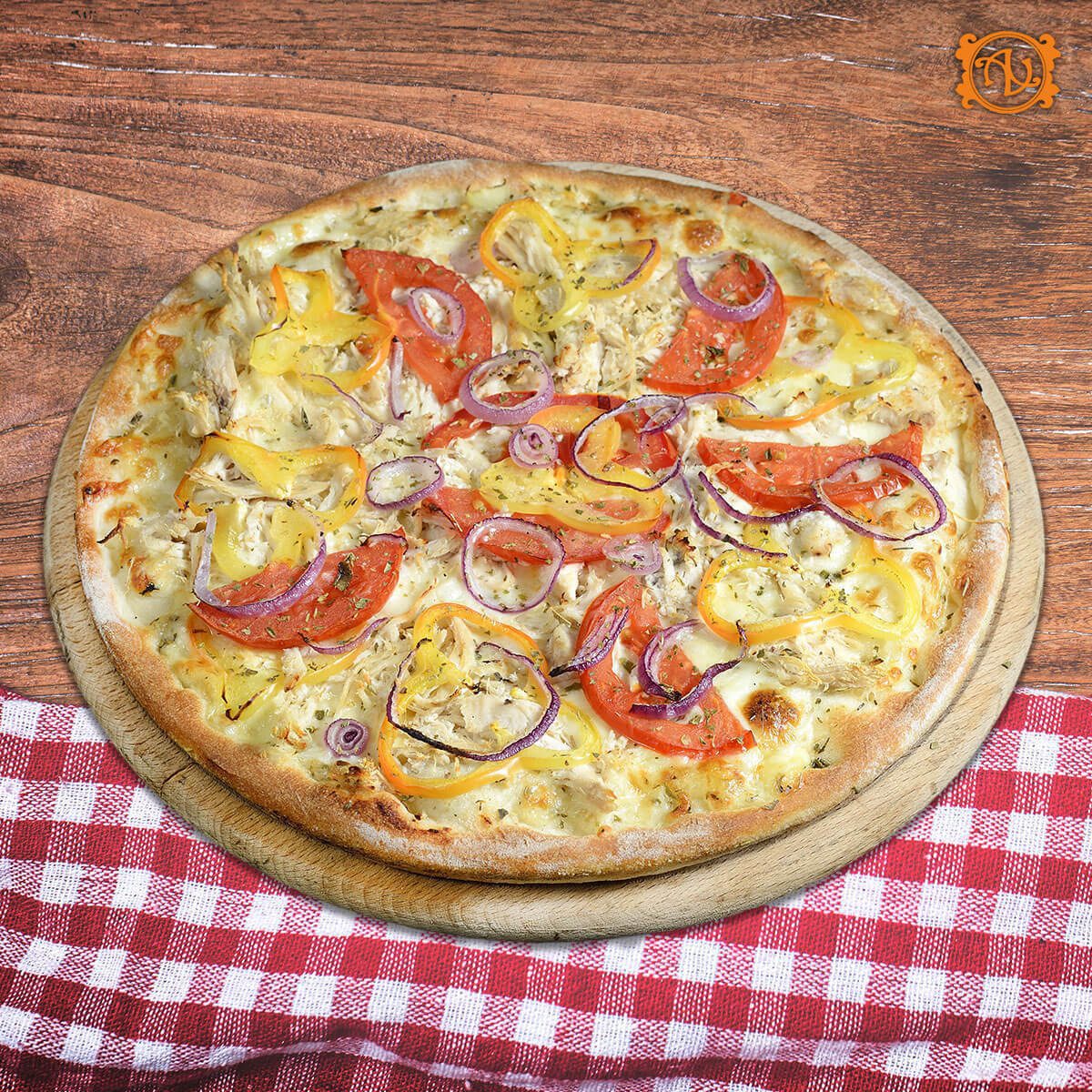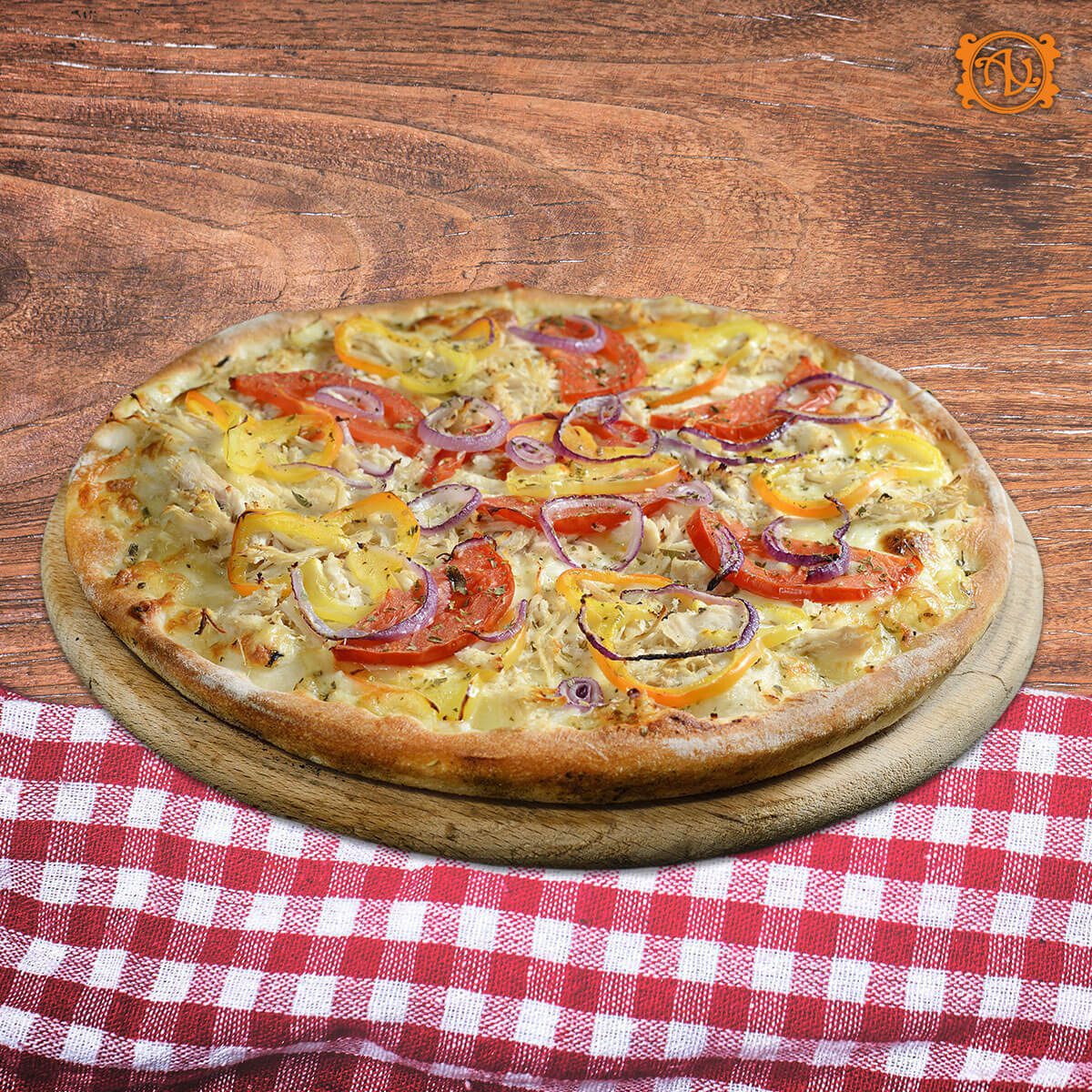 aluat, sos, mozzarella, piept pui*, ceapă, ardei gras, roșii