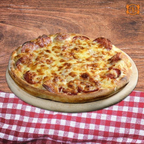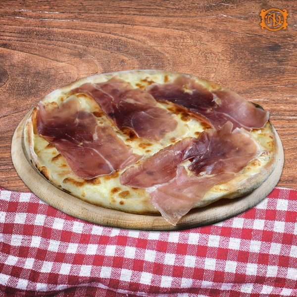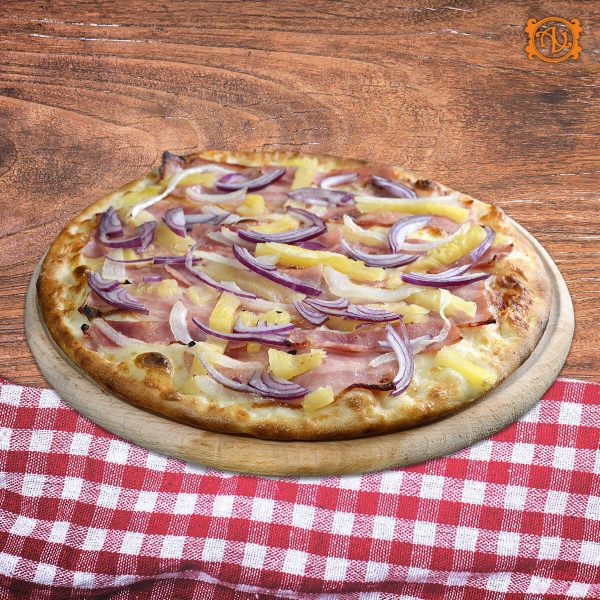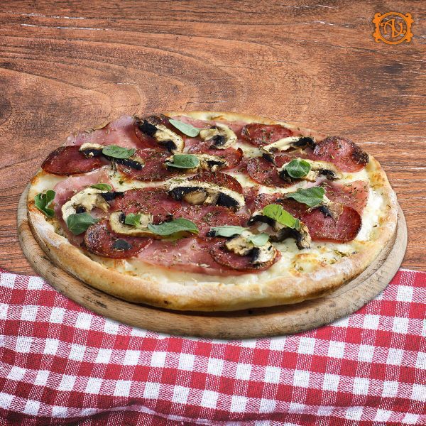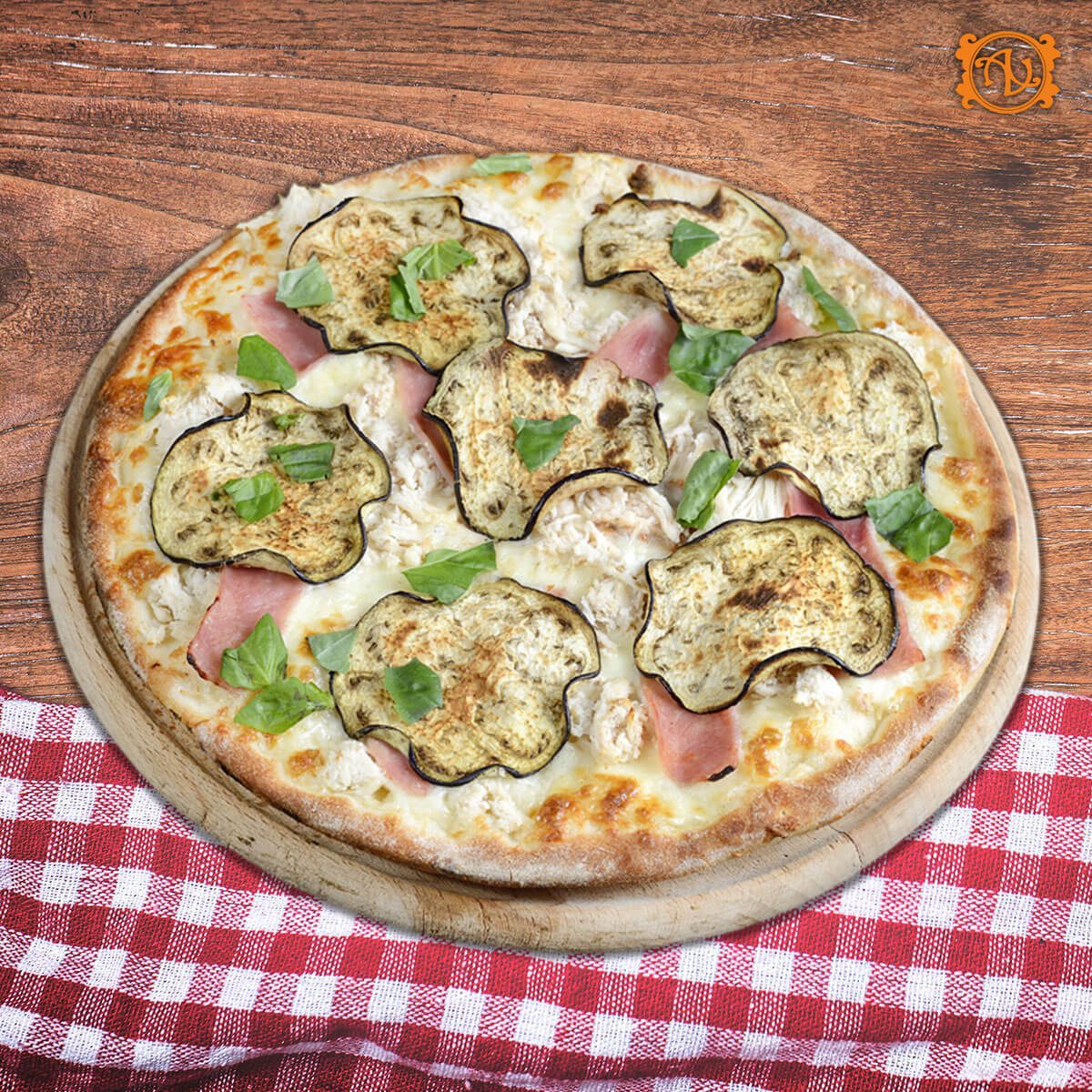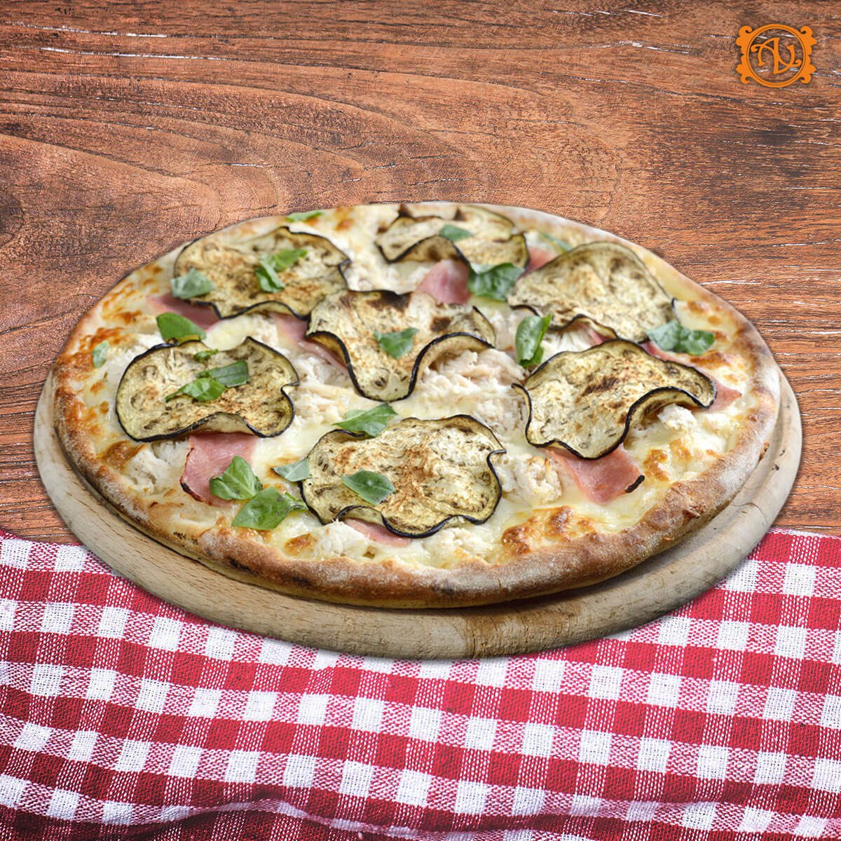 aluat, sos, mozzarella, şuncă, piept de pui*, vinete, busuioc proaspăt
