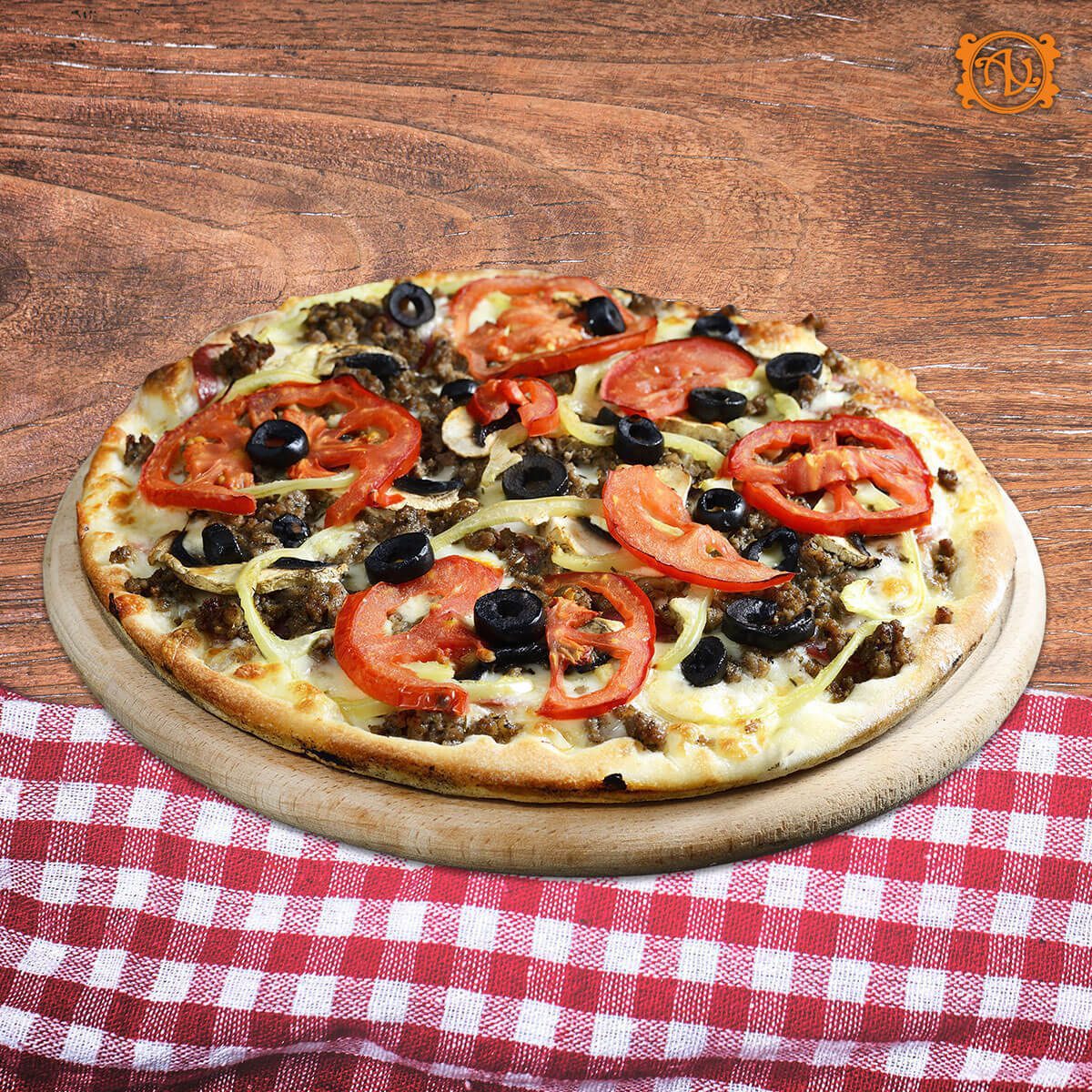 aluat, sos, mozzarella, salam, carne de vită*, ardei gras, măsline, roșii, ciuperci
