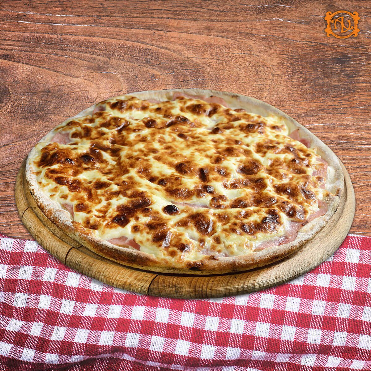 aluat, sos, mozzarella, șuncă, ou, smântână