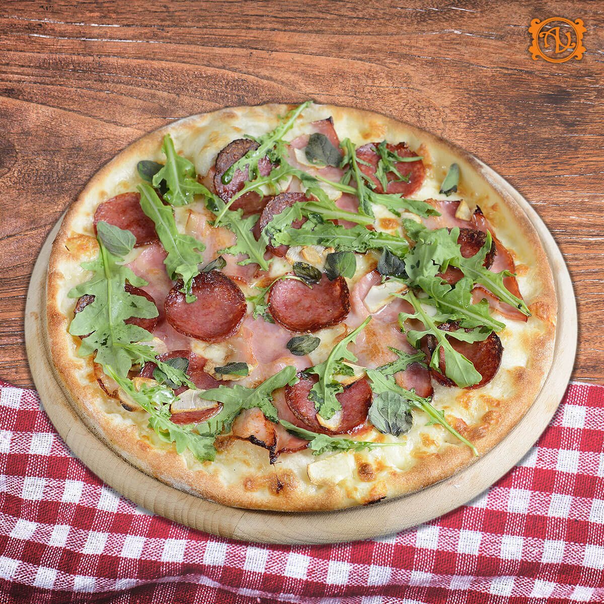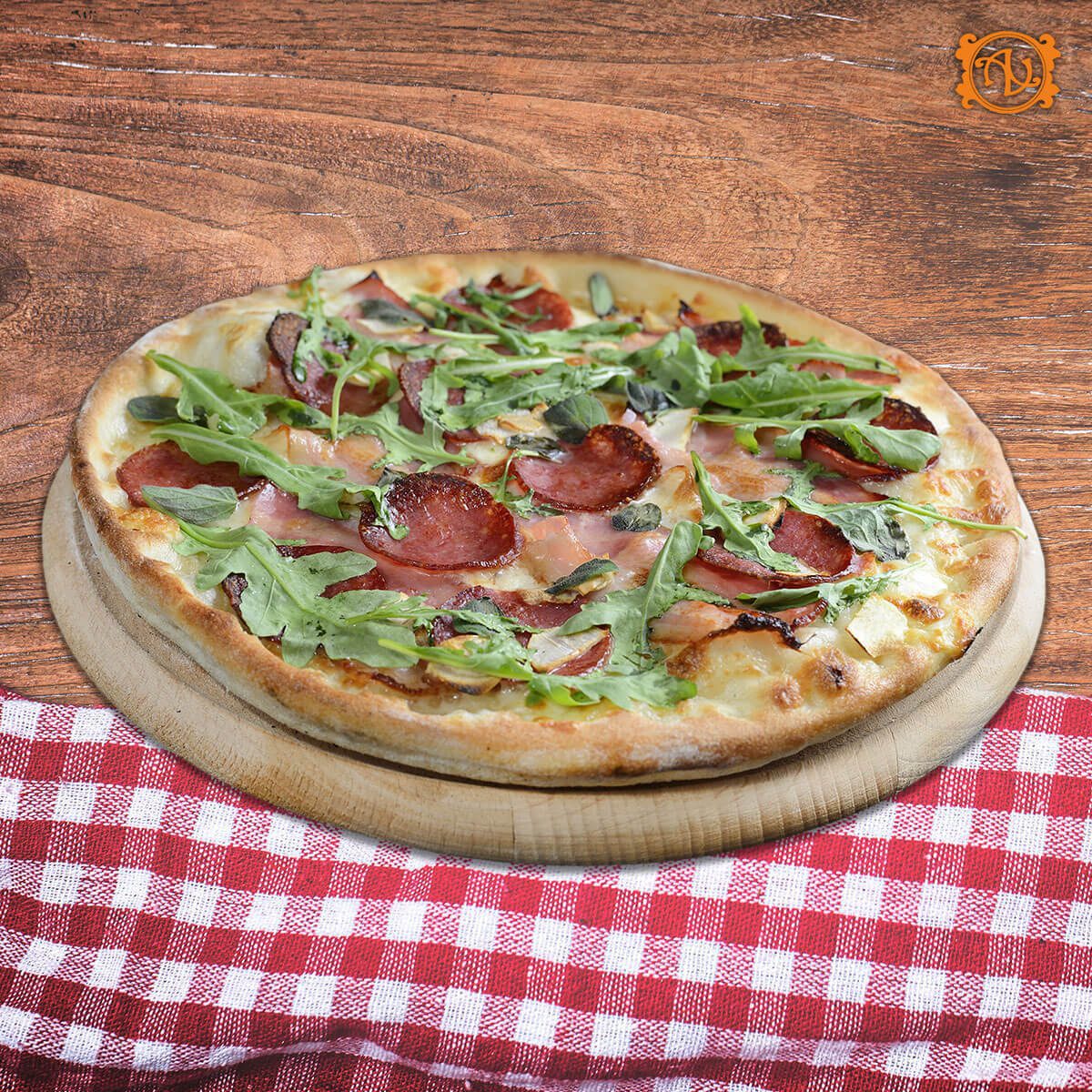 aluat, sos, mozzarella, salam, bacon, oregano, usturoi, rucola