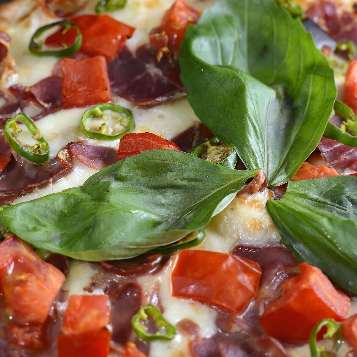 aluat, sos, mozzarella, roşii, prosciutto, ardei iute, busuioc proaspăt